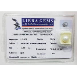 REPORT NO . LP 677CLARITY . N/ACOLOUR . SHINING WHITESHAPE / CUT . ROUNDWT . 4.00 CTSDIMENSION . 8-1.8-1.7-1.R . INDEX . N/AHARDNESS . 3.0COMMENT . PEARL..