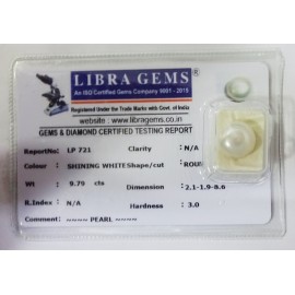 REPORT NO . LP 721CLARITY . N/ACOLOUR . SHINING WHITESHAPE / CUT . ROUNDWT . 9.79 CTSDIMENSION . 2-1.1-9.8-6.R . INDEX . N/AHARDNESS . 3.0COMMENT . PEARL..