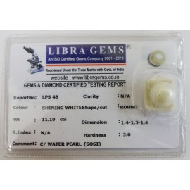 REPORT NO . LPS 48CLARITY . N/ACOLOUR . SHINING WHITESHAPE / CUT . ROUNDWT . 11.19 CTSDIMENSION . 1-4.1-3.1-4.R . INDEX . N/AHARDNESS . 3.0COMMENT . C / WATER PEARL [ SOSI }..