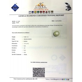 DATE:14-10-2023REF.NO: LP 1300NAME:PEARLWEIGHT:9.60 CTSCOLOUR:SHINING WHITETYPE OF/CUT:ROUNDDIMENSION:1.7-2.1-9.1CONCLUSION:N/AHARDNESS:3.0R.INDEX:N/ACLARITY:N/ASPECIFIC COMMENTS:PEARL..