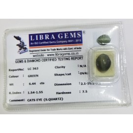 REPORT.NO.-LC 363CLARITY.-N/ACOLOUR.-GREENSHAPE/CUT.-OVALWT.-6.44 CTSDIMENSION.-2-1.10-1.7-9.R.INDEX.-1.54-1.55HARDNESS.-7.5COMMENT.-CATS EYE { S . QUARTZ }..