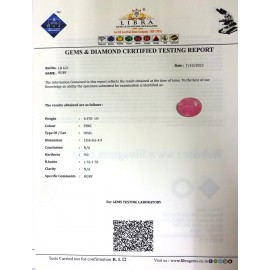 DATE:7-10-2023REF.NO:LR 621NAME:RUBYWEIGHT:4.37 CTSCOLOUR:PINKTYPE OF/CUT:OVALDIMENSION:10.8-8.6-4.9CONCLUSION:N/AHARDNESS:9.0R.INDEX:1.76-1.78CLARITY:N/ASPECIFIC COMMENTS:RUBY..