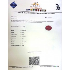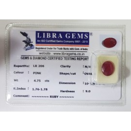 REPORT NO . LR 206CLARITY . N/ACOLOUR . PINKSHAPE / CUT . OVALWT . 4.75 CTSDIMENSION . 10-5.8-6.5-4.R . INDEX . 1.76-1.78HARDNESS . 9.0COMMENT . RUBY..
