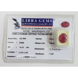 REPORT.NO.-LR 399CLARITY.-N/ACOLOUR.-PINKSHAPE/CUT.-OVALWT.-4.13 CTSDIMENSION.-1-7.9-3.3-8.R.INDEX.-1.76-1.78HARDNESS.-9.0COMMENT.-RUBY..