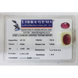 REPORT.NO.-LR 518CLARITY.-N/ACOLOUR.-PINKSHAPE/CUT.-OVALWT.-5.18 CTSDIMENSION.-9-2.9-1.5-4.R.INDEX.-1.76-1.78HARDNESS.-9.0COMMENT.-RUBY..