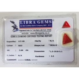 REPORT NO . LCI 69CLARITY . N/ACOLOUR . REDSHAPE / CUT . TRIANGLEWT . 3.69 CTSDIMENSION . 1-5.10-8.5-1.R . INDEX . N/AHARDNESS . 3.5COMMENT . CORAL..