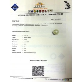 REPORT NO . LP 793CLARITY . N/ACOLOUR . SHINING WHITESHAPE / CUT . ROUNDWT . 6.26 CTSDIMENSION . 10-1.10-1.7-5.R . INDEX . N/AHARDNESS . 3.0COMMENT . PEARL..