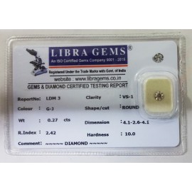REPORT NO . LDM 3CLARITY . VS-1COLOUR . G-JSHAPE / CUT . ROUNDWT . 0.27 CTSDIMENSION  . 4-1.2-6.4-1.R . INDEX . 2.42HARDNESS . 10.0COMMENT . DIAMOND..