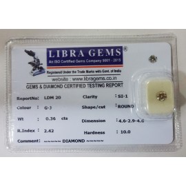 REPORT NO . LDM 10CLARITY . SI-1COLOUR . G-JSHAPE / CUT . ROUNDWT . 0.34 CTSDIMENSION . 4-3.3-1.4-3.R . INDEX . 2.42HARDNESS . 10.0COMMENT . DIAMOND..