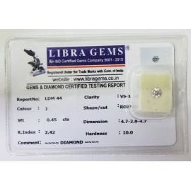 REPORT.NO.LDM 44CLARITY.VS-1COLOUR.JSHAPE/CUT.ROUNDWT.0.45 CTSDIMENSION.4.7-4.7-2.8R.INDEX.2.42HARDNESS.10.0COMMENT.DIAMOND..