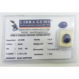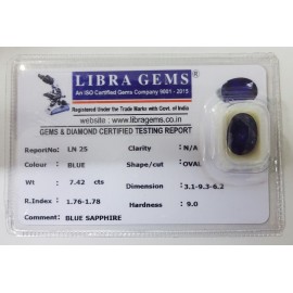 REPORT NO . LN 25CLARITY . N/ACOLOUR . BLUESHAPE / CUT . OVALWT . 7.42 CTSDIMENSION . 3-1.9-3.6-2.R . INDEX . 1.76-1.78HARDNESS . 9.0COMMENT . BLUE SAPPHIRE..
