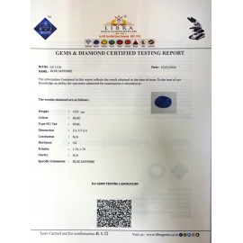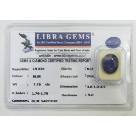 REPORT.NO.LN 636CLARITY.N/ACOLOUR.BLUESHAPE/CUT.OVAL WT.7.78 CTSDIMENSION.3.8-1.3-4.9R.INDEX.1.76-1.7.8HARDNESS.9.0COMMENT.BLUE SAPPHIRE..