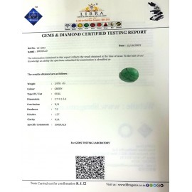 REPORT NO . LE 114CLARITY . N/ACOLOUR . GREENSHAPE / CUT . OVALWT . 3.74 CTSDIMENSION . 1-8.9-5.4-9.R . INDEX . 1.57HARDNESS . 7.5COMMENT . EMERALD..
