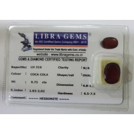 REPORT.NO.-LH 316CLARITY.-N/ACOLOUR.-COCA COLASHAPE/CUT.-OVALWT.-9.75 CTSDIMENSION.-4-8.1-3.6-4.R.INDEX.-1.92-2.02HARDNESS.-6.5-7.5COMMENT.-HESSONITE..