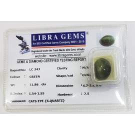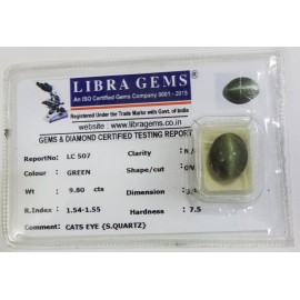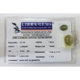 REPORT.NO.LC 291CLARITY.N/ACOLOUR.GREENSHAPE/CUT.OVALWT.10..76 CTSDIMENSION.4.6-1.5-9.1R.INDEX.1.54-1.55HARDNESS.7.5COMMENT.CATS EYE {S.QUARTZ}..
