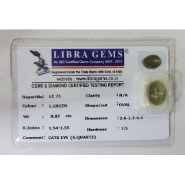 REPORT NO . LC 28CLARITY . N/ACOLOUR . L . GREENSHAPE / CUT . OVALWT . 5.22 CTSDIMENSION . 10-8.9-6.6-9.R . INDEX . 1.54-1.55HARDNESS . 7.5COMMENT . CATS EYE { S . QUARTZ }..