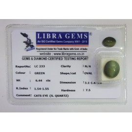 REPORT NO . LC 248CLARITY . N/ACOLOUR . GREENSHAPE / CUT . OVALWT . 8.01 CTSDIMENSION . 3-6.10-4.7-6.R . INDEX . 1.54-1.55HARDNESS . 7.5COMMENT . CATS EYE { S . QUARTZ }..