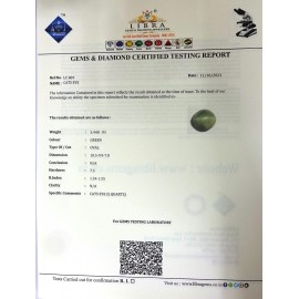 DATE:15-8-2024REF.NO:LCK 8NAME:CATS EYEWEIGHT:3.48 CTSCOLOUR:L.GREENTYPE OF/CUT:OVALDIMENSION:9.1-8.7-4.9CONCLUSION:N/AHARDNESS:7.5R.INDEX:1.54-1.55CLARITY:N/ASPECIFIC COMMENTS:CATS EYE {K}..