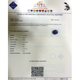REPORT.NO.LN 352CLARITY.N/ACOLOUR.BLUE SHAPE/CUT.OVALWT.7.34 CTSDIMENSION.2.1-9.5-7.5R.INDEX.1.76-1.78HARDNESS.9.0COMMENT.BLUE SAPPHIRE ..