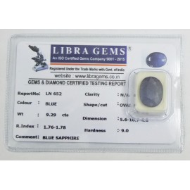 REPORT.NO.-LN 521CLARITY.-N/ACOLOUR.-BLUESHAPE/CUT.-OVALWT.-9.20 CTSDIMENSION.-5-1.1-4.5-4.R.INDEX.-1.76-1.78HARDNESS.-9.0COMMENT.-BLUE SAPPHIRE..