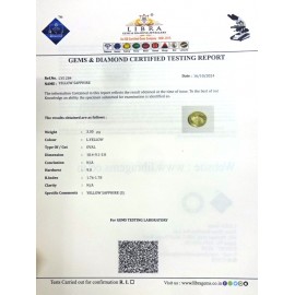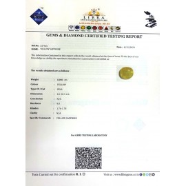 DATE:16-10-2024REF.NO:LYS 279NAME:YELLOW SAPPHIREWEIGHT:4.10 CTSCOLOUR:L.YELLOW TYPE OF/CUT:OVALDIMENSION:9.1-7.7-6.1CONCLUSION:N/AHARDNESS:9.0R.INDEX:1.76-1.78CLARITY:N/ASPECIFIC COMME..
