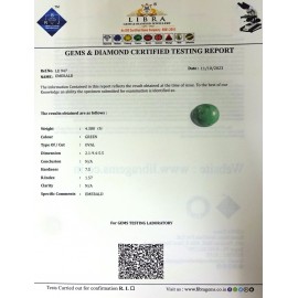 DATE:11-10-2023REF.NO:LE 938NAME:EMERALDWEIGHT:4.77 CTSCOLOUR:GREENTYPE OF/CUT:OVALDIMENSION:2-4.9-8.4-7.CONCLUSION:N/AHARDNESS:7.5R.INDEX:1.57CLARITY:N/ASPECIFIC COMMENTS:EMERALD..