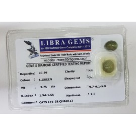 REPORT NO . LC 39CLARITY . N/ACOLOUR . L . GREENSHAPE / CUT . ROUNDWT . 3.75 CTSDIMENSION . 9-7.9-1.5-9.R . INDEX . 1.54-1.55HARDNESS . 7.5COMMENT . CATS EYE { S . SQUARTZ }..
