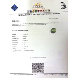 REPORT NO . LC 242CLARITY . N/ACOLOUR . GREENSHAPE / CUT . OVALWT . 6.46 CTSDIMENSION . 3-6.9-5.6-6.R . INDEX . 1.54-1.55HARDNESS . 7.5COMMENT . CATS EYE { S . QUARTZ }..