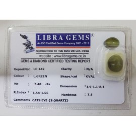 REPORT NO . LC 184CLARITY . N/ACOLOUR . L . GREENSHAPE / CUT . OVALWT . 5.89 CTSDIMENSION . 2-4.10-8.6-3.R . INDEX . 1.54-1.55HARDNESS . 7.5COMMENT . CATS EYE { S . QUARTZ }..