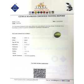 DATE:13-10-2023REF.NO:LC 1037NAME:CATS EYE WEIGHT:3.37 CTSCOLOUR:GREENTYPE OF/CUT:OVALDIMENSION:9.5-9.1-5.9CONCLUSION:N/AHARDNESS:7.5R.INDEX:1.54-1.55CLARITY:N/ASPECIFIC COMMENTS:CATS E..