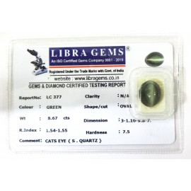 REPORT.NO.-LC 390CLARITY.-N/ACOLOUR.-GREENSHAPE/CUT.-OVALWT.-7.12 CTSDIMENSION.-2-1.9-8.8-4.R.INDEX.-1.54-1.55HARDNESS.-7.5COMMENT.-CATS EYE { S . QUARTZ }..